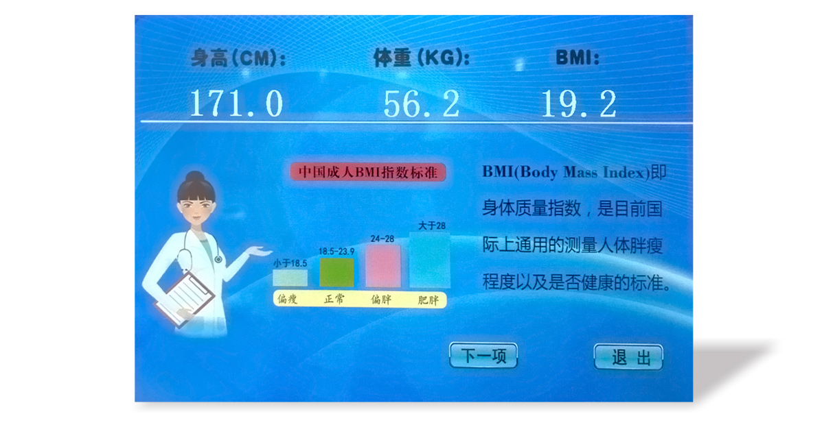 身高体重测量、体温测量、体型指数测量、血压脉搏测量、心率测量、脂肪测量、基础代谢、血氧饱和测量